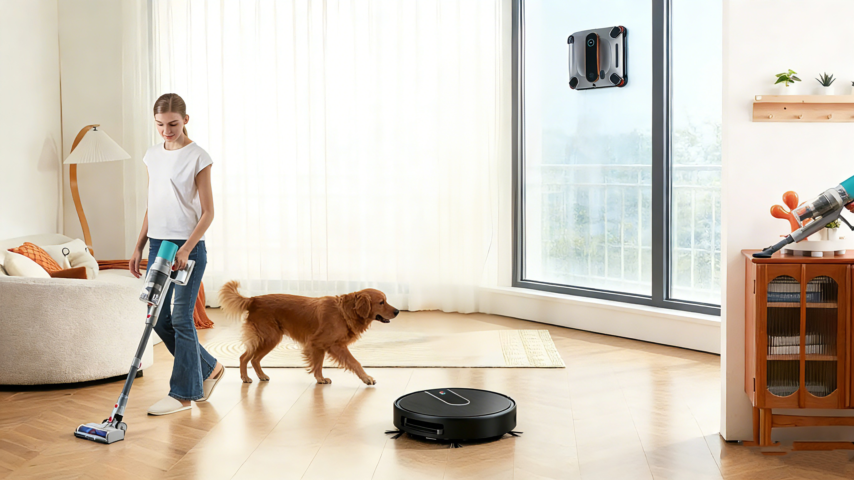 Standard English: Effortlessly removes any dirt, from pet hair to gravel.